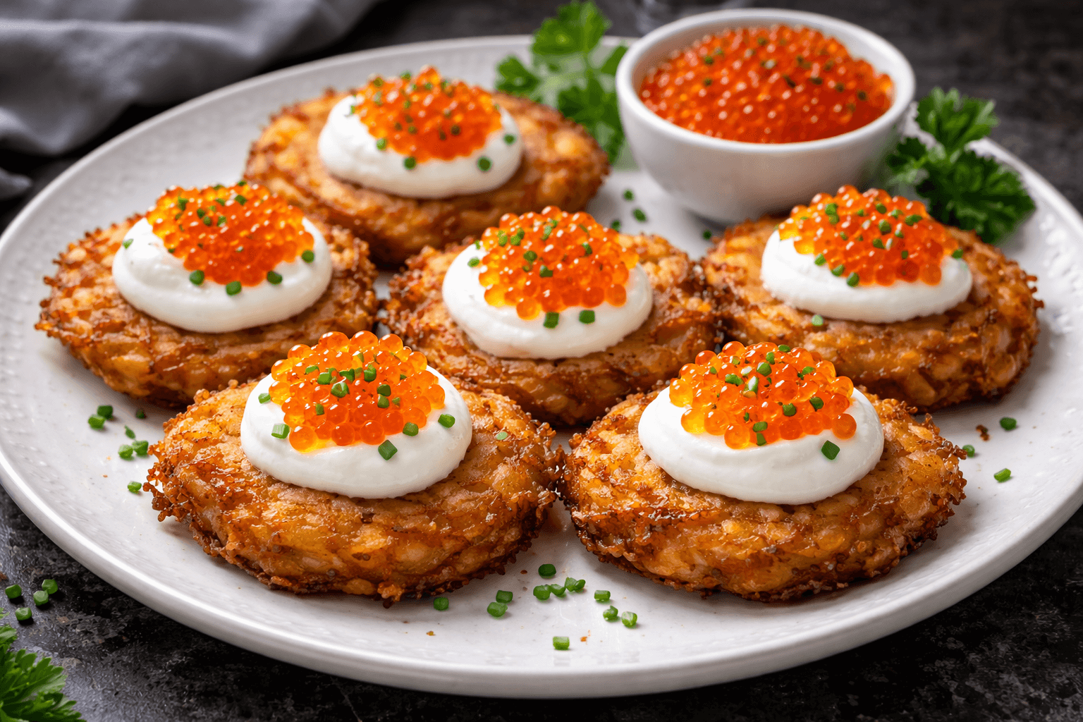 Картофель натирают на мелкой тёрке и тщательно отжимают лишнюю влагу. Затем добавляют яйцо, соль и немного муки. Драники жарят небольшими, буквально на один-два укуса, добиваясь хрустящей корочки снаружи и мягкой текстуры внутри. Для подачи используют крем из сливочного сыра или густой сметаны. На каждый драник выкладывают крем и добавляют икру. В качестве украшения подойдёт зелёный лук или микрозелень.